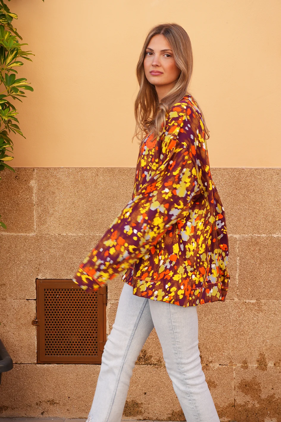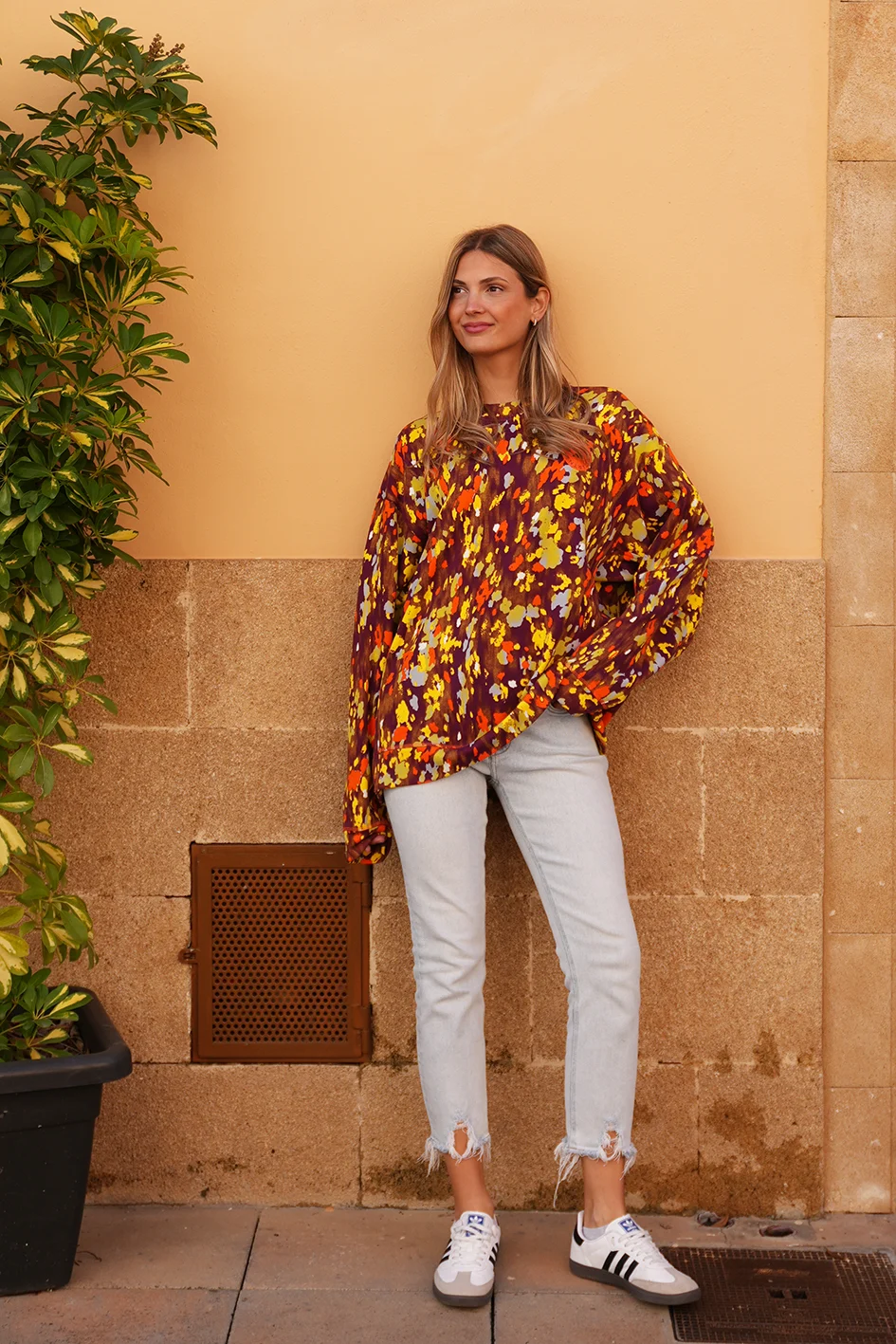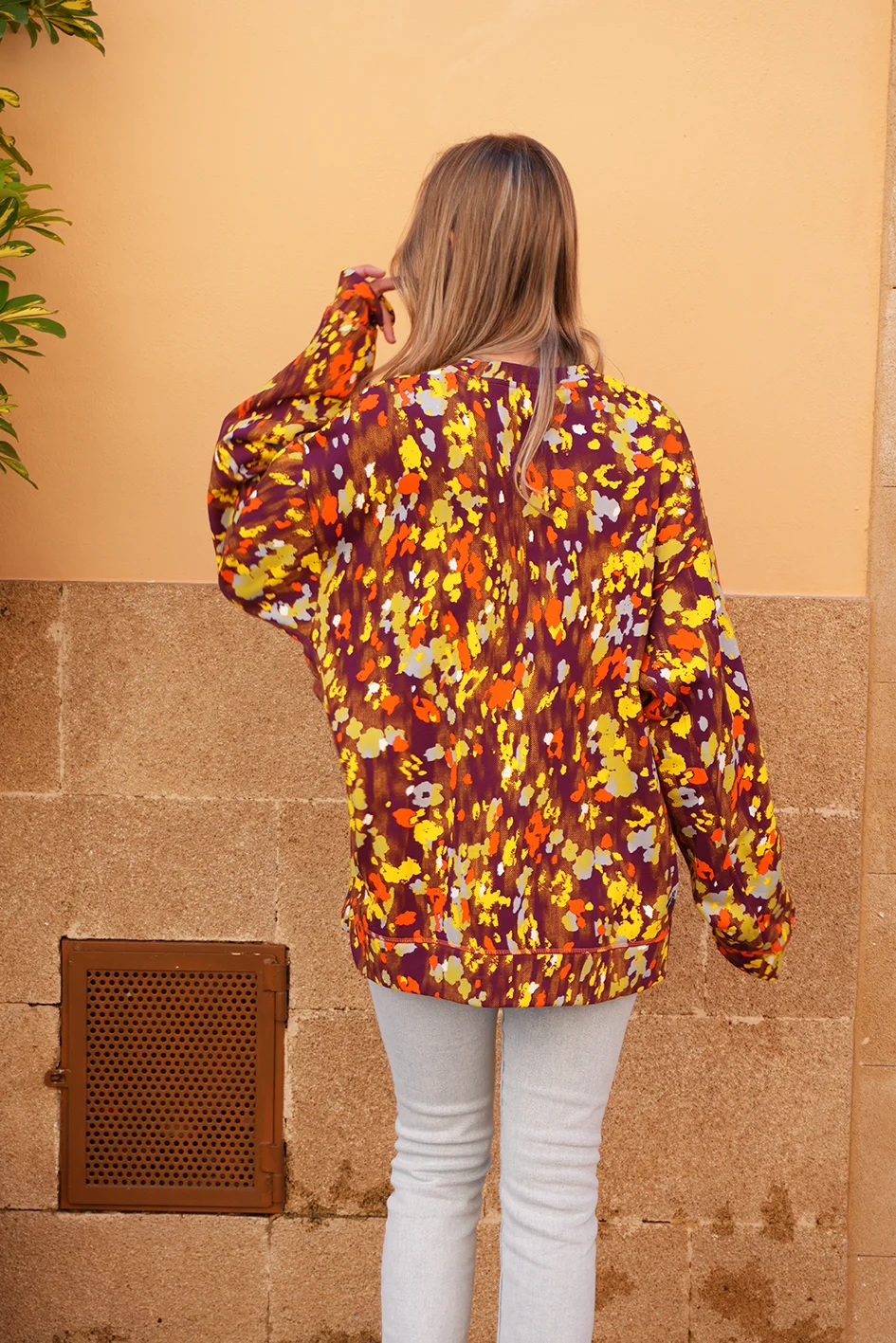 This vibrant multicolor abstract sweater features a bold abstract floral print in warm autumn tones and dramatic balloon sleeves that create a statement silhouette.