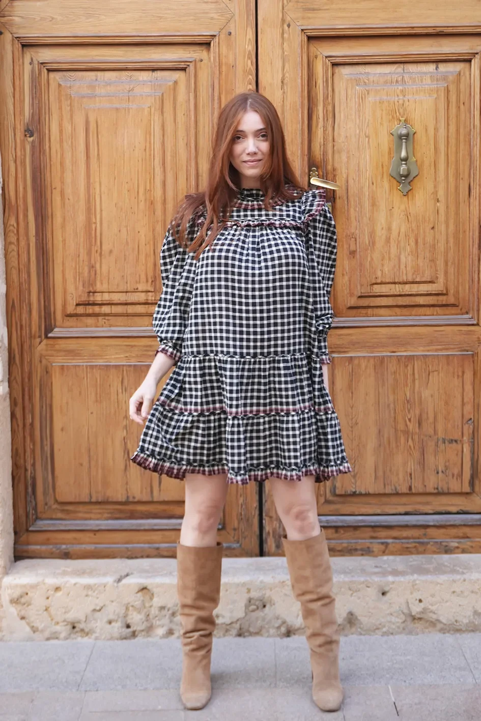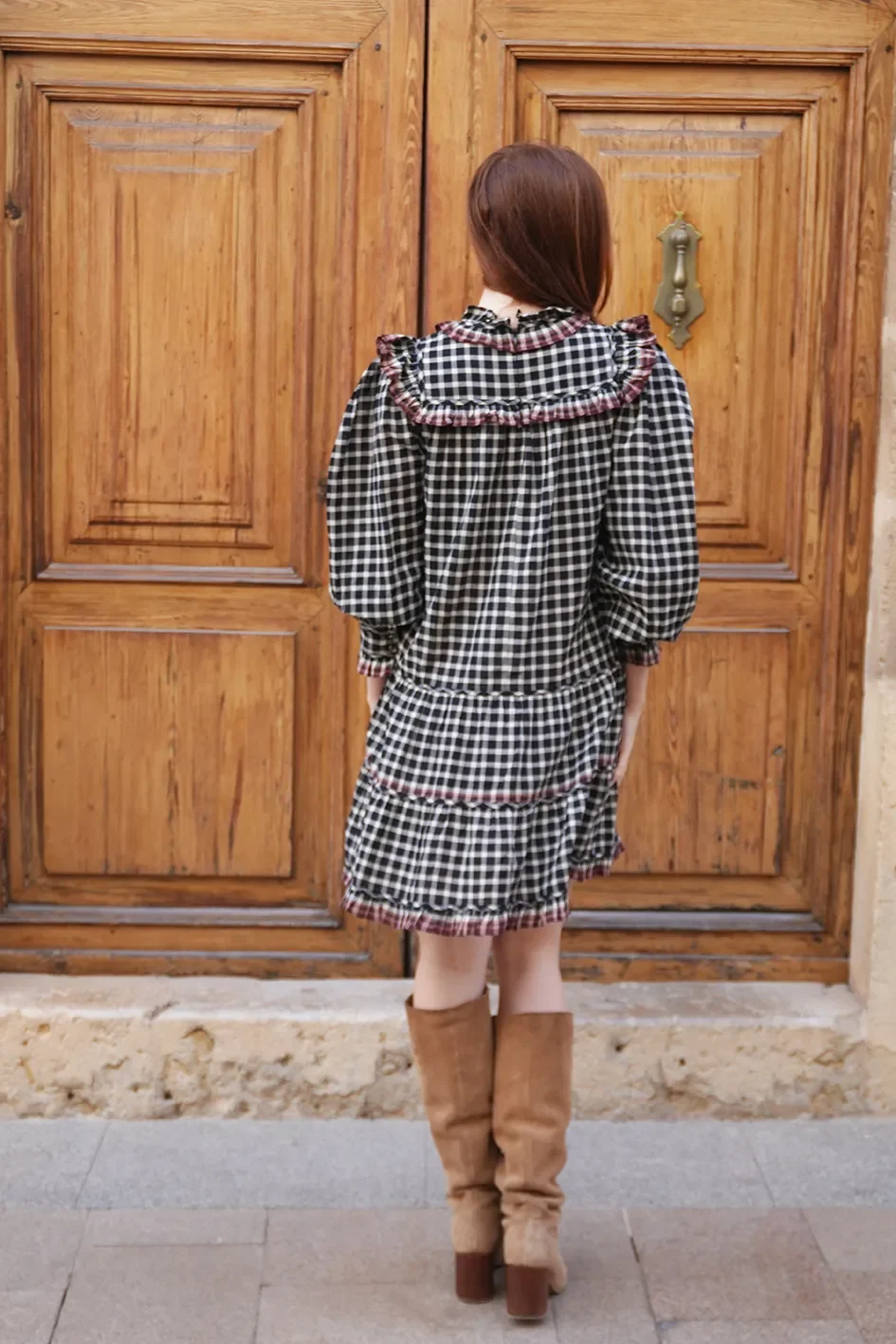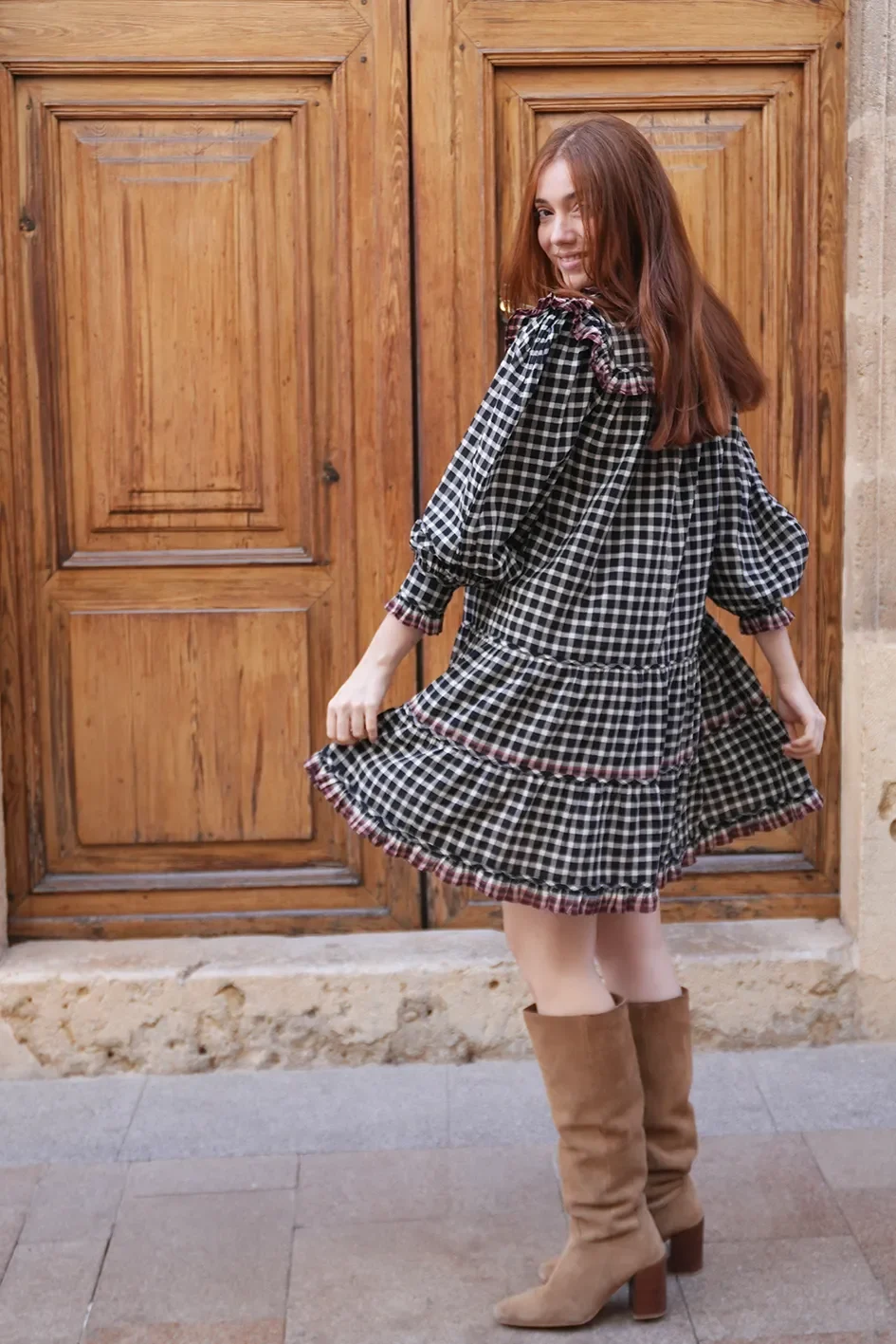 This charming Ulla Johnson gingham midi dress from AW 2022 features a classic black and white check pattern with a delicate ruffled collar, voluminous puffed sleeves, and sweet tiered ruffles along the hem. The relaxed fit and playful details create a feminine, retro-inspired silhouette that’s perfect for styling with boots or tights.