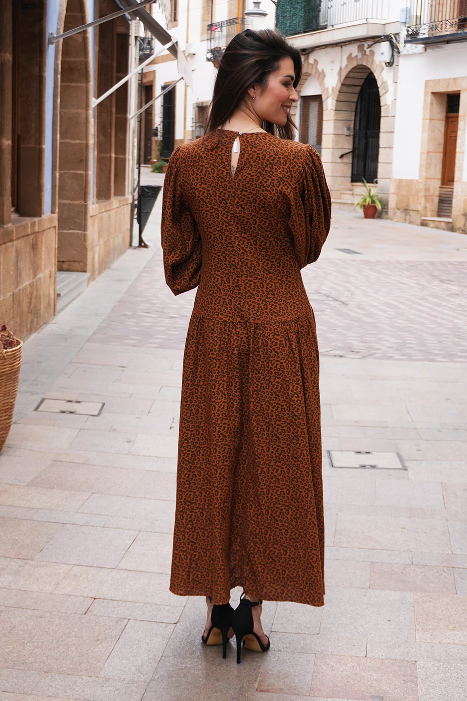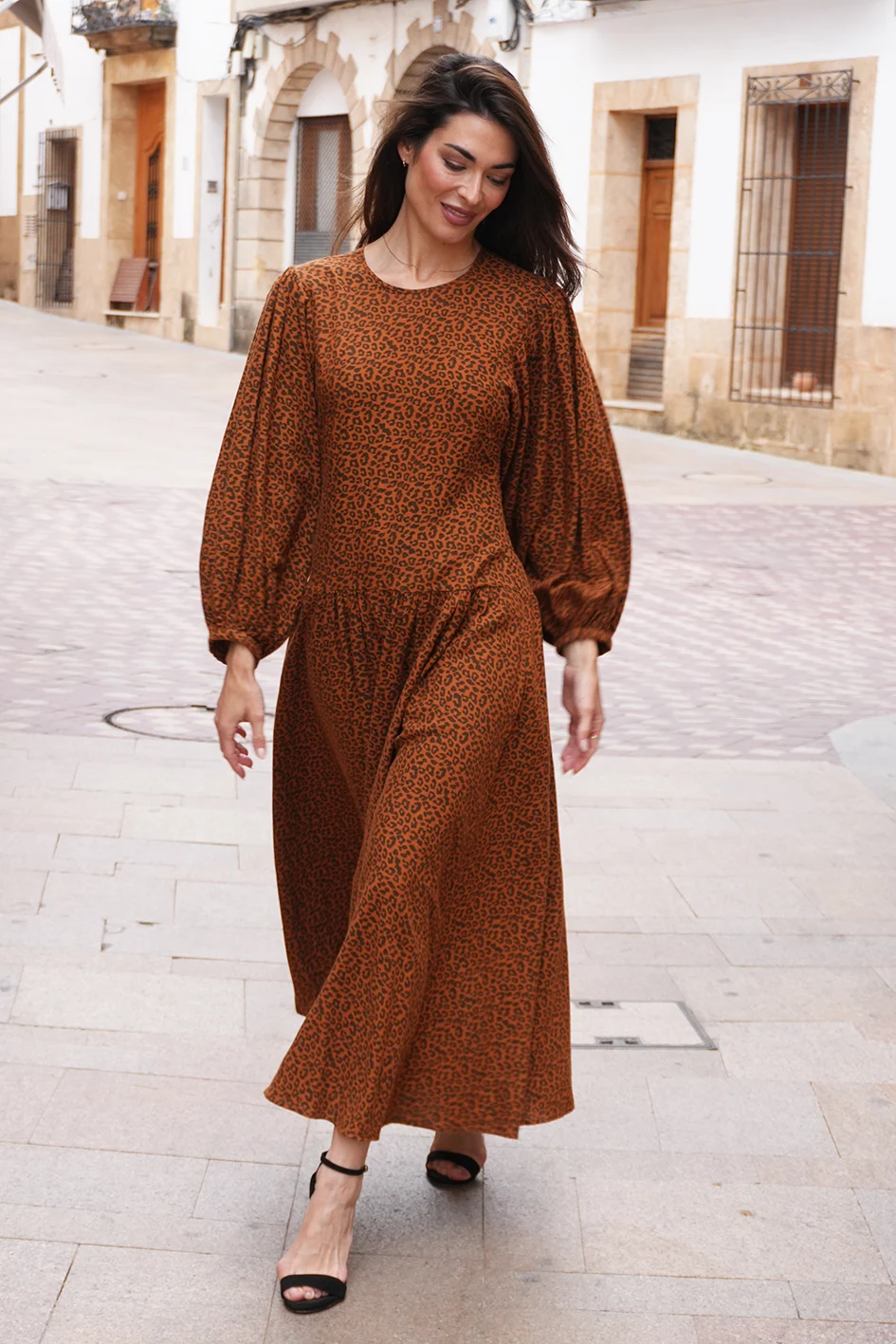 A timeless leopard maxi dress with a soft round neck, dramatic long sleeves, and a relaxed flowing fit.