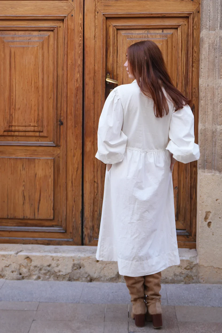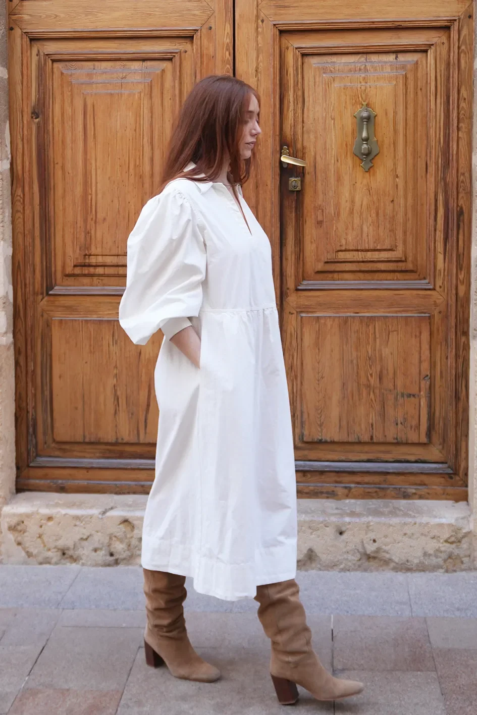 This elegant Sea New York midi dress features a soft white cotton with a flattering V-neckline, voluminous puffed sleeves, and a gently gathered waist that creates a relaxed yet feminine silhouette.