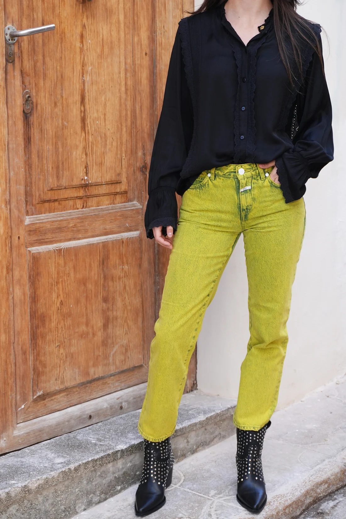 These acid green straight-leg jeans from Closed Limited Edition feature a flattering high-rise fit and a comfortable stretch denim that hugs in all the right places. The bold, vibrant acid green hue makes them a striking statement piece that instantly brightens any outfit while remaining easy to style with neutrals or contrasting colors.