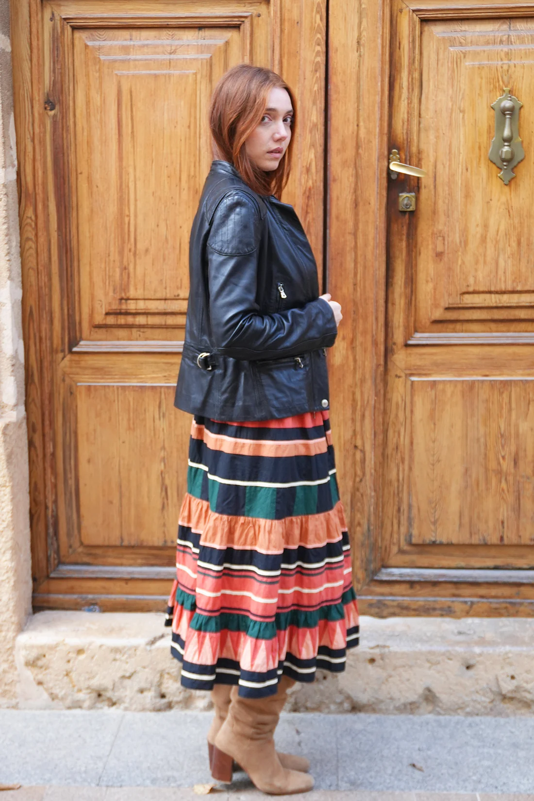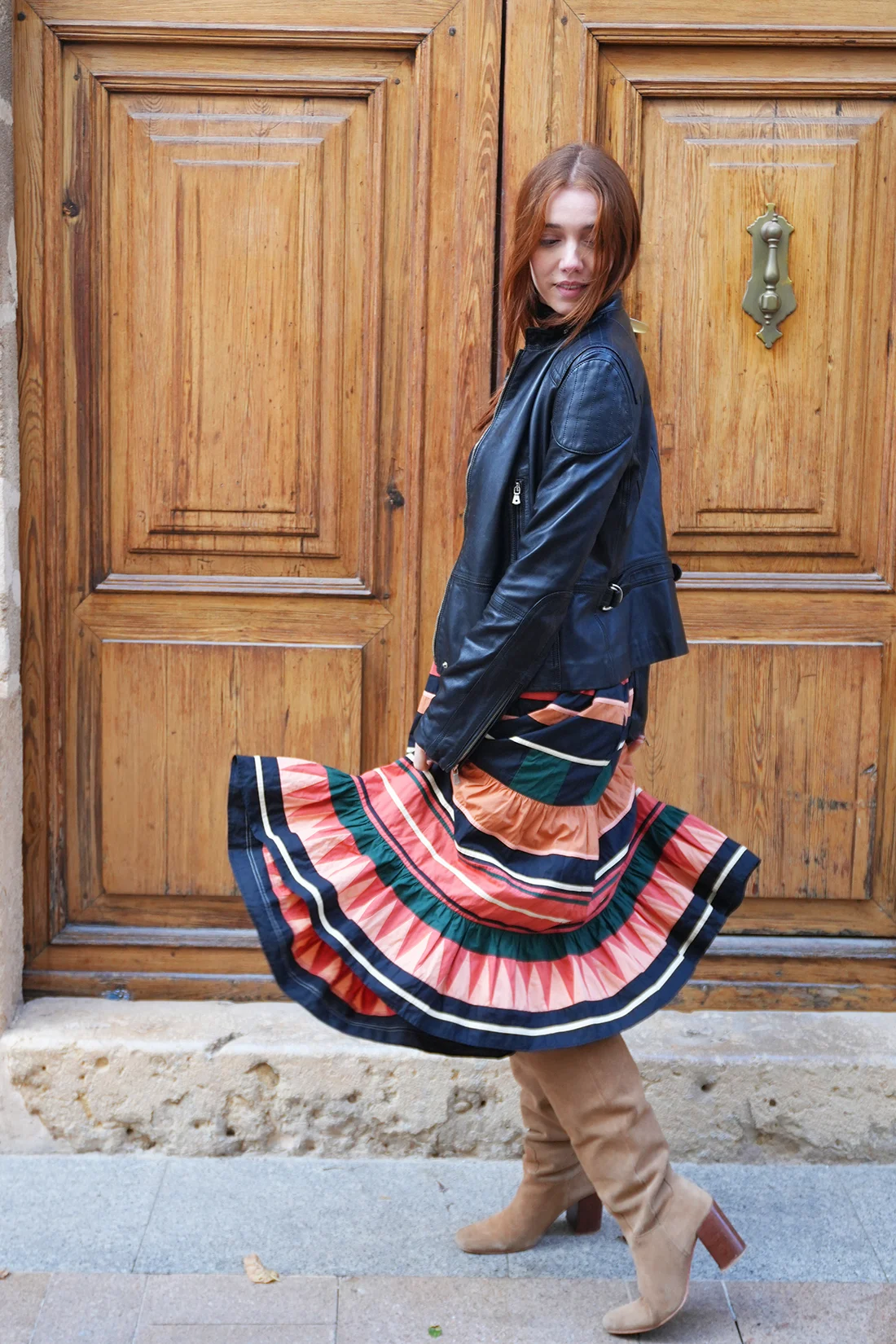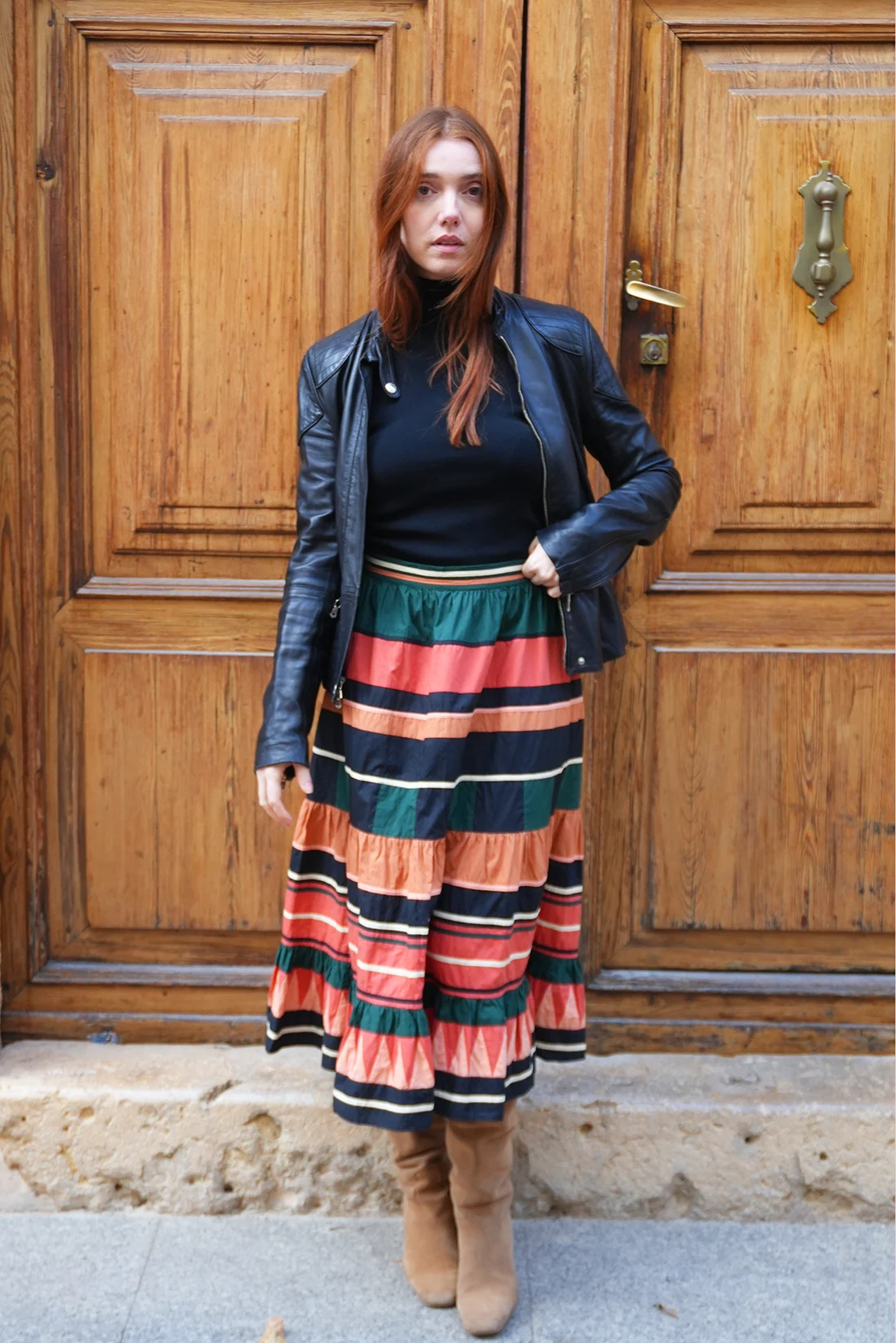 Ulla Johnson graphic striped midi skirt with bold multicolour horizontal stripes in coral, navy, and green, finished with soft ruffled tiers on airy fabric for an effortless, feminine silhouette.