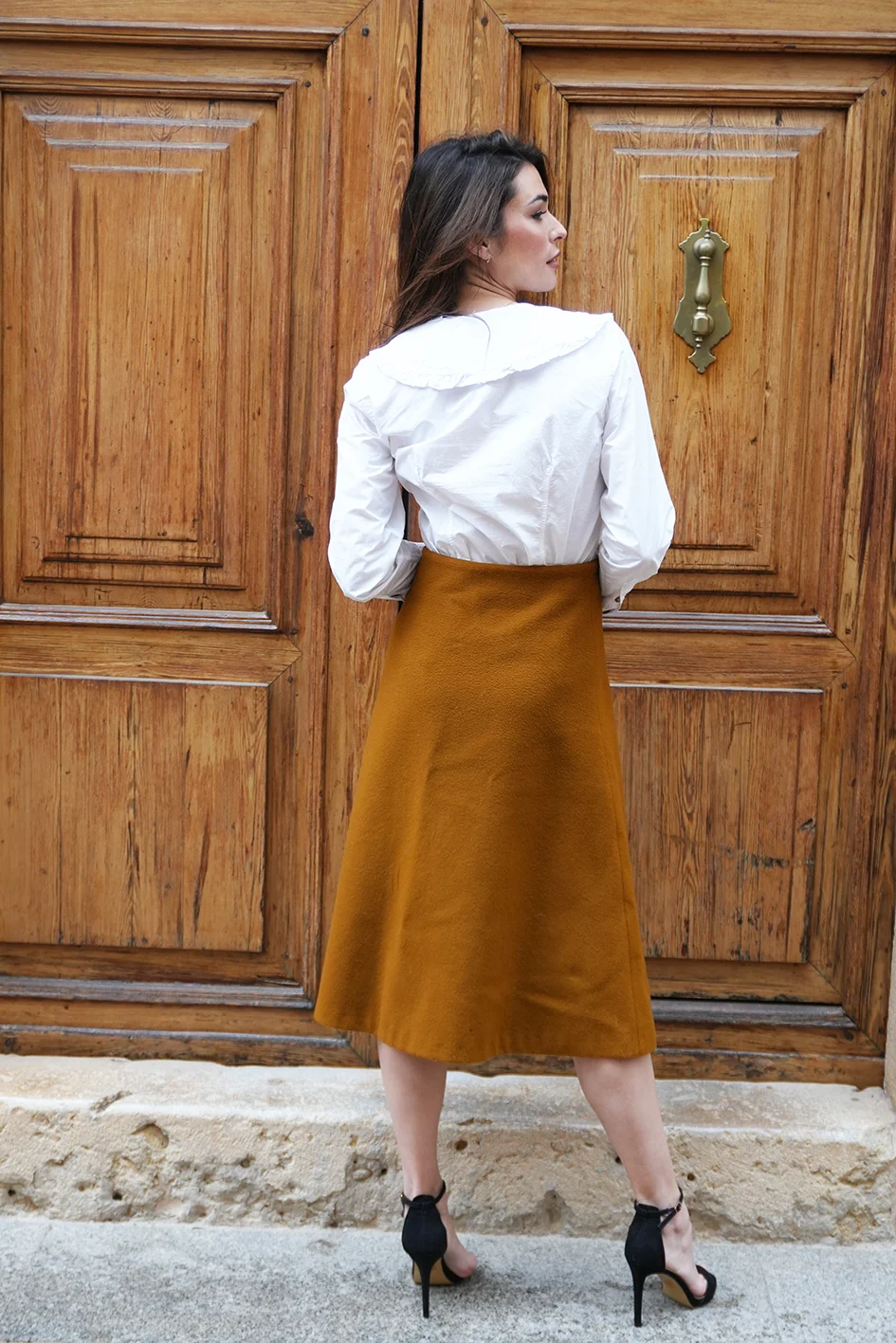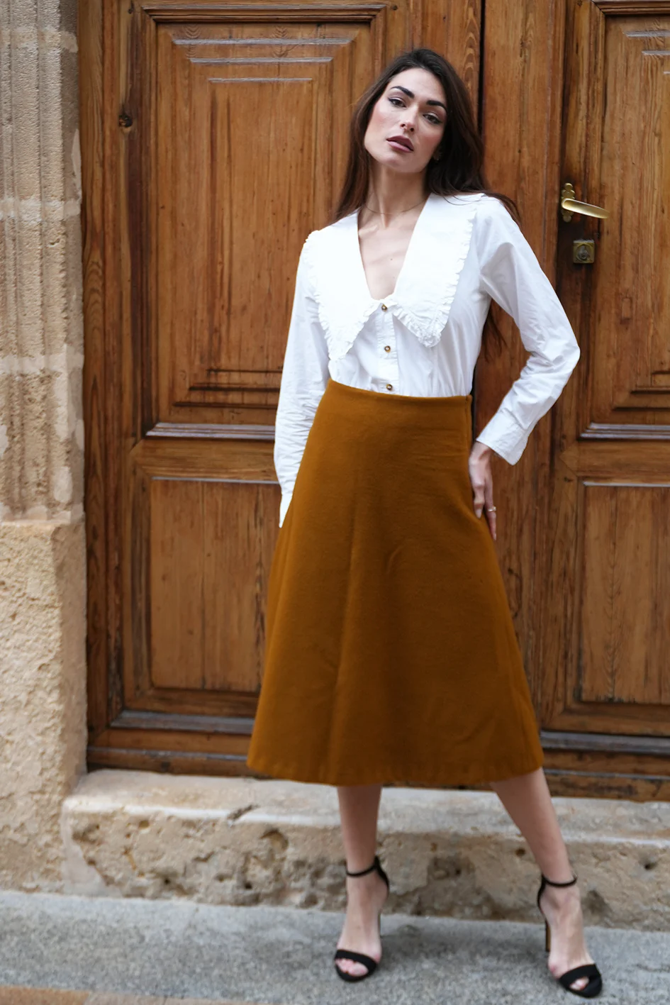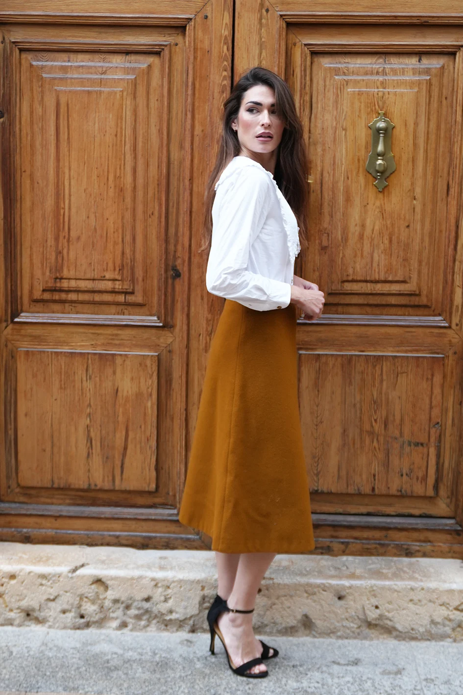 This elegant mustard-brown midi skirt from Nanushka features a soft, slightly brushed texture with a flattering A-line silhouette and a clean, minimalist cut. The rich warm tone makes it incredibly versatile, pairing beautifully with the crisp white blouse for a polished yet effortless look.