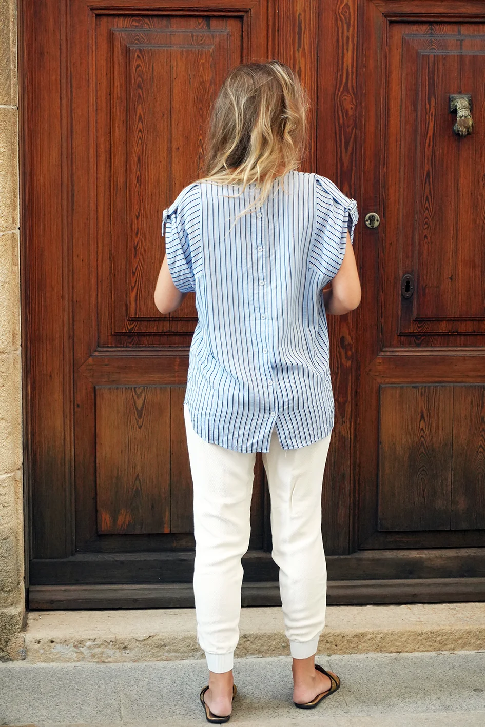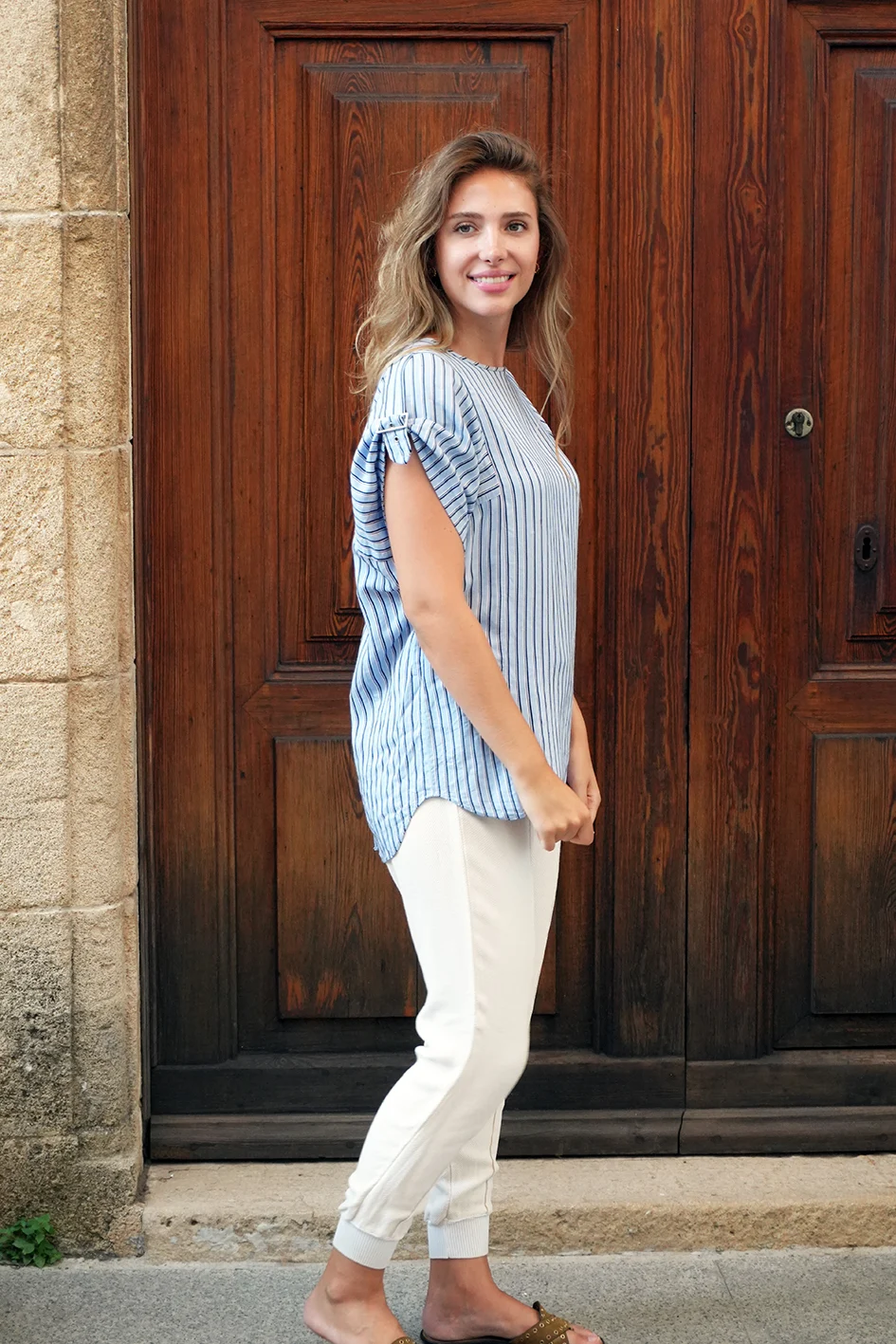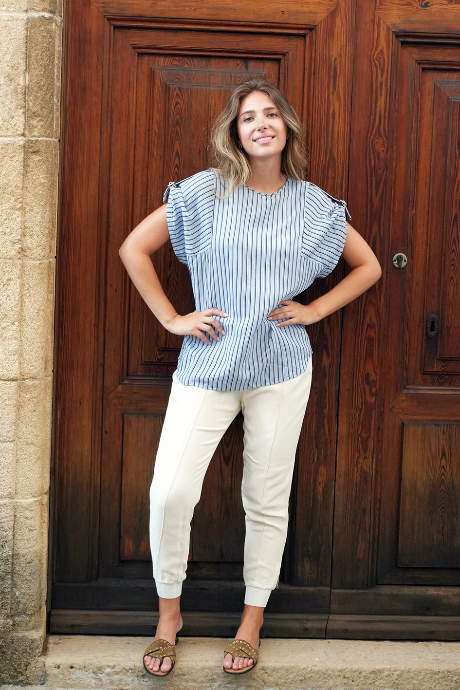 This lightweight Tibi top features a soft blue and white vertical stripe pattern with a relaxed fit and charming flutter sleeves that add feminine movement. The breezy fabric and easy silhouette make it an effortless everyday piece that pairs beautifully with jeans, trousers, or shorts